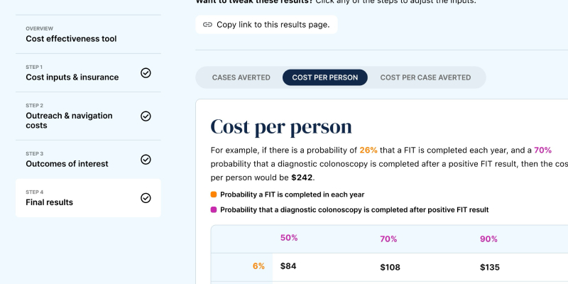 This set of tools is designed to inform decision-making from the clinic level to the national level about how to invest limited resources to maximize impact on the health of low-income, medically underserved populations. We will guide you through inputting costs of FIT vs. colonoscopy-based approaches over time and their ramifications on the cost-effectiveness of different screening approaches, considering different perspectives and time horizons. We also use causal loop diagramming, a qualitative approach to documenting requirements and ripple effects of different approaches as well as their complex tradeoffs.