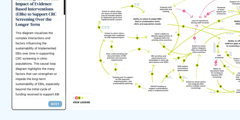 This set of tools is designed to inform decision-making from the clinic level to the national level about how to invest limited resources to maximize impact on the health of low-income, medically underserved populations. We will guide you through inputting costs of FIT vs. colonoscopy-based approaches over time and their ramifications on the cost-effectiveness of different screening approaches, considering different perspectives and time horizons. We also use causal loop diagramming, a qualitative approach to documenting requirements and ripple effects of different approaches as well as their complex tradeoffs.